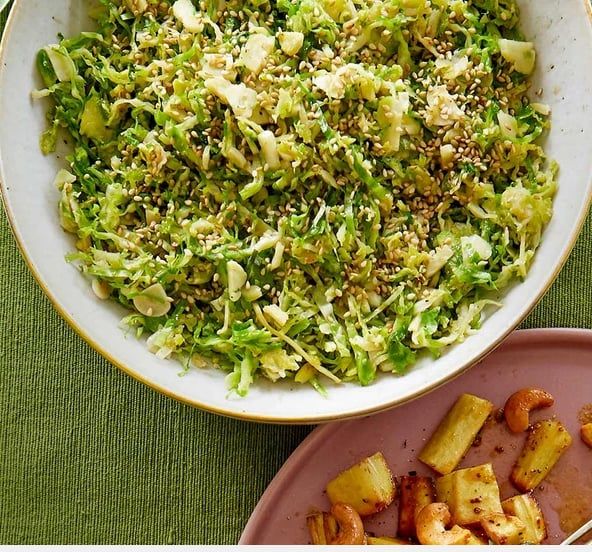 Heat the oil in a wok and fry the ginger and garlic for 1 min. Add the shredded sprouts and stir-fry for 1-2 mins until wilted. Pour in the Shaoxing wine, then the honey sauce. Toss everything together. Season, drizzle with the sesame oil, scatter with sesame seeds and serve.