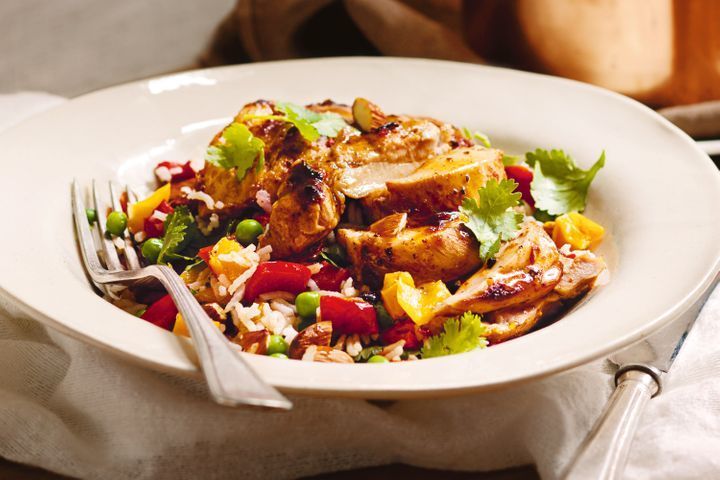 Serve chicken with rice.